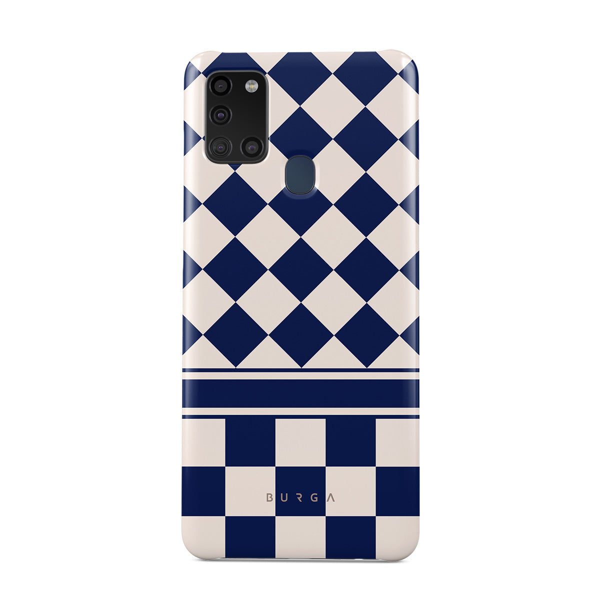 Embrace the essence of subtle luxury with our Check & Mate Samsung Galaxy A21s 4G phone case design. Blending eggshell and deep blue checkers, it evokes whispers of elegance. While diamonds grace the upper half, the lower half features a timeless chessboard pattern.