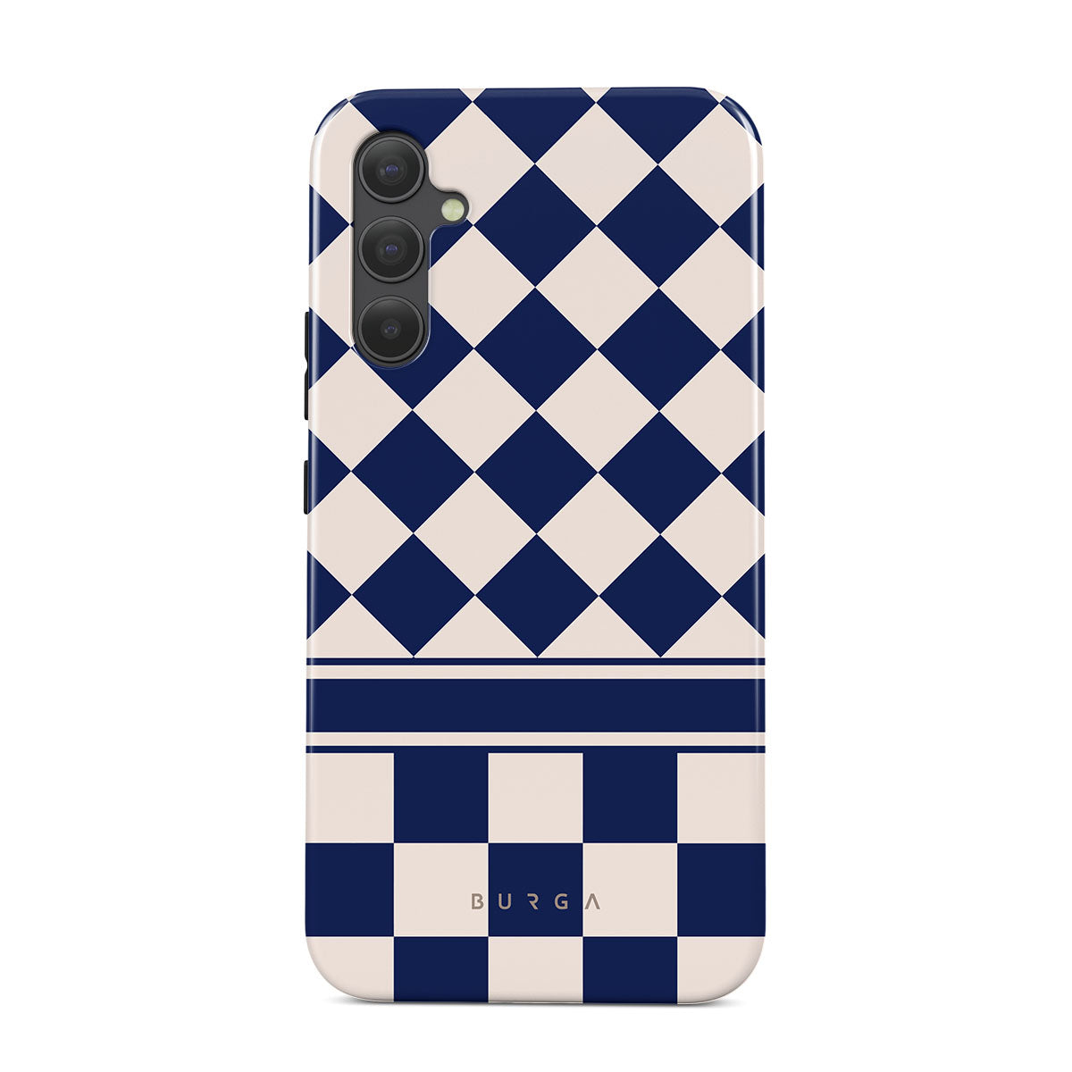 Embrace the essence of subtle luxury with our Check & Mate Samsung Galaxy A34 phone case design. Blending eggshell and deep blue checkers, it evokes whispers of elegance. While diamonds grace the upper half, the lower half features a timeless chessboard pattern.