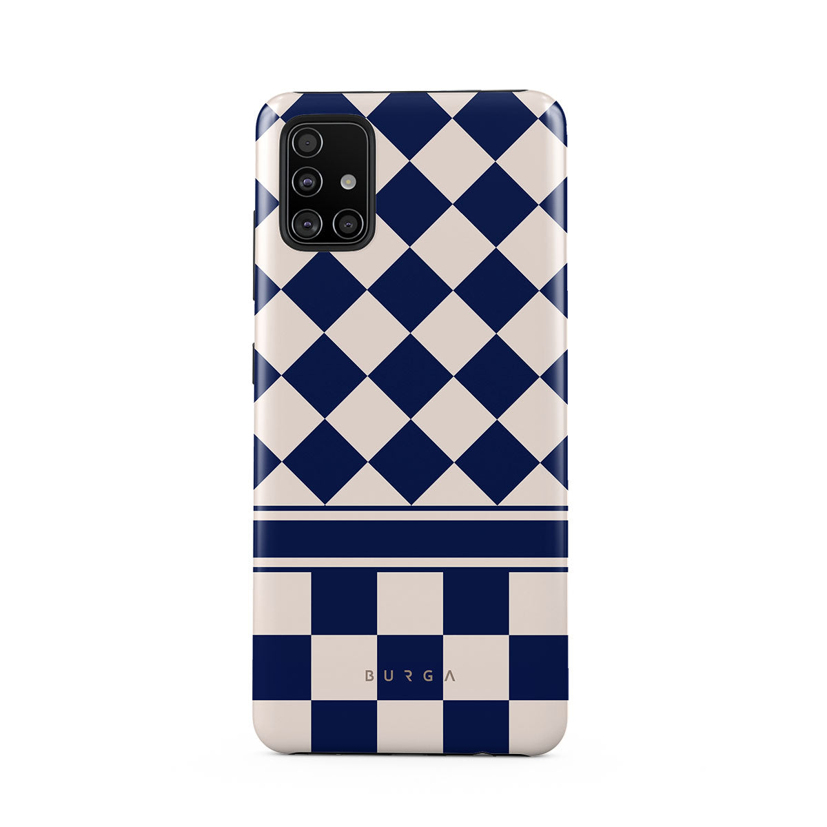 Embrace the essence of subtle luxury with our Check & Mate Samsung Galaxy A51 4G phone case design. Blending eggshell and deep blue checkers, it evokes whispers of elegance. While diamonds grace the upper half, the lower half features a timeless chessboard pattern.