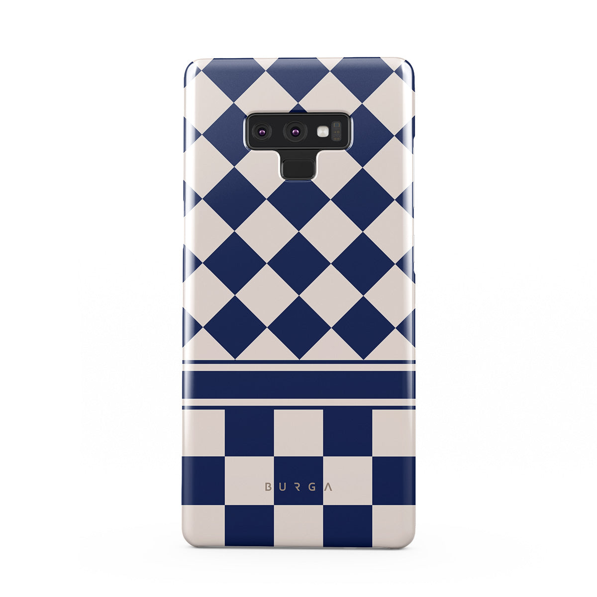 Embrace the essence of subtle luxury with our Check & Mate Samsung Galaxy Note 9 phone case design. Blending eggshell and deep blue checkers, it evokes whispers of elegance. While diamonds grace the upper half, the lower half features a timeless chessboard pattern.
