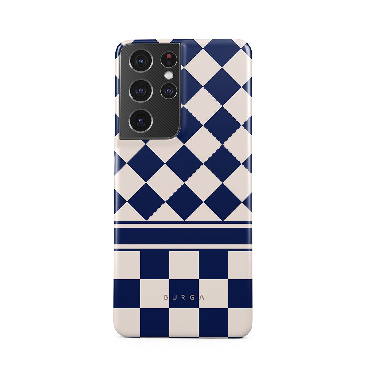 Embrace the essence of subtle luxury with our Check & Mate Samsung Galaxy S21 Ultra phone case design. Blending eggshell and deep blue checkers, it evokes whispers of elegance. While diamonds grace the upper half, the lower half features a timeless chessboard pattern.