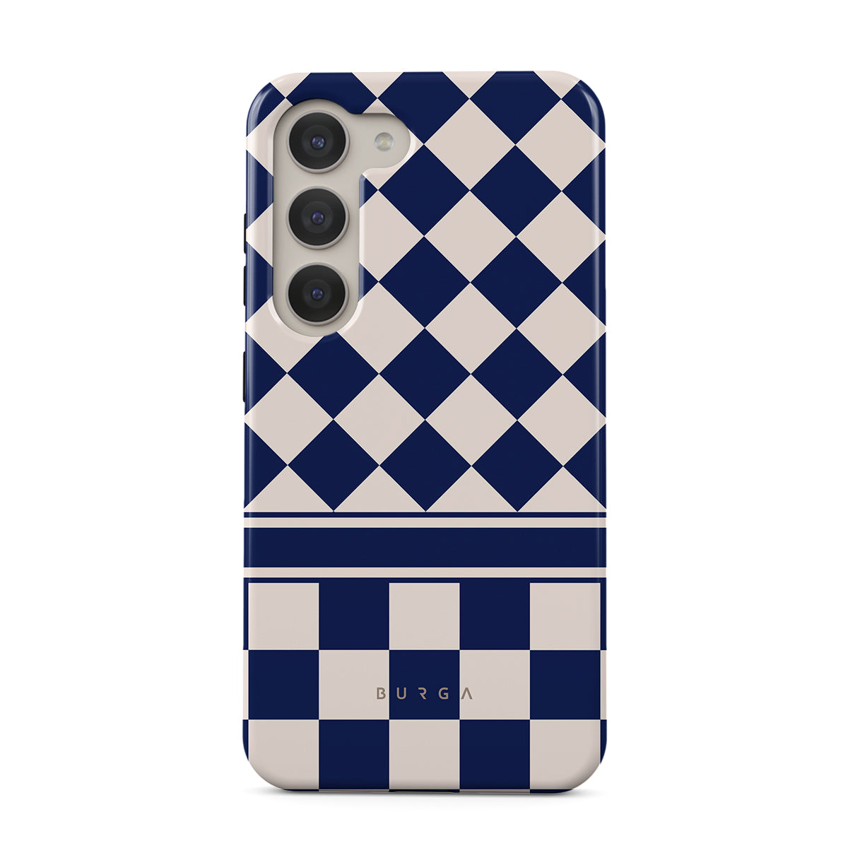 Embrace the essence of subtle luxury with our Check & Mate Samsung Galaxy S23 phone case design. Blending eggshell and deep blue checkers, it evokes whispers of elegance. While diamonds grace the upper half, the lower half features a timeless chessboard pattern.