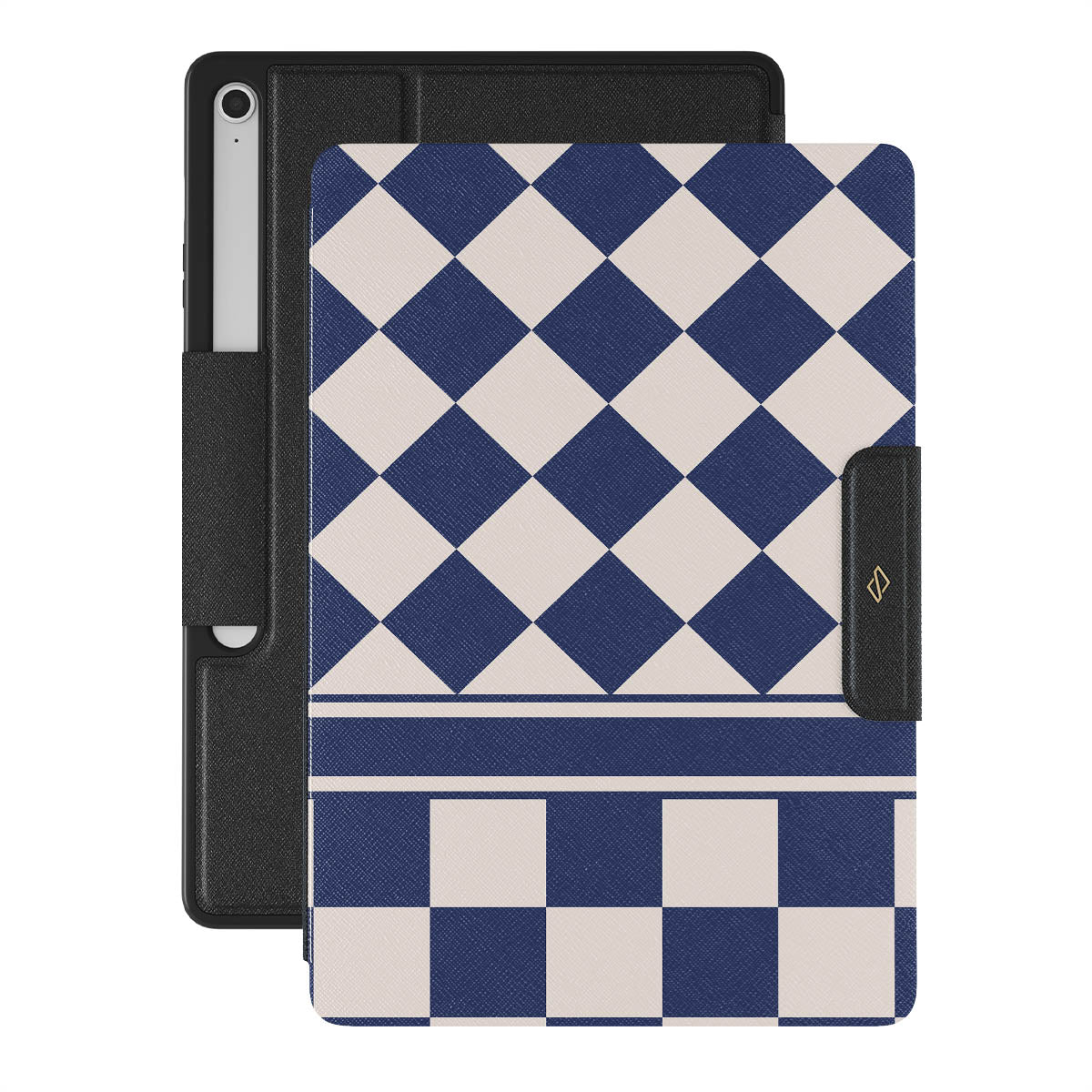 Embrace the essence of subtle luxury with our Check & Mate Samsung Galaxy Tab S10+ FE folio case design. Blending eggshell and deep blue checkers, it evokes whispers of elegance. While diamonds grace the upper half, the lower half features a timeless chessboard pattern.