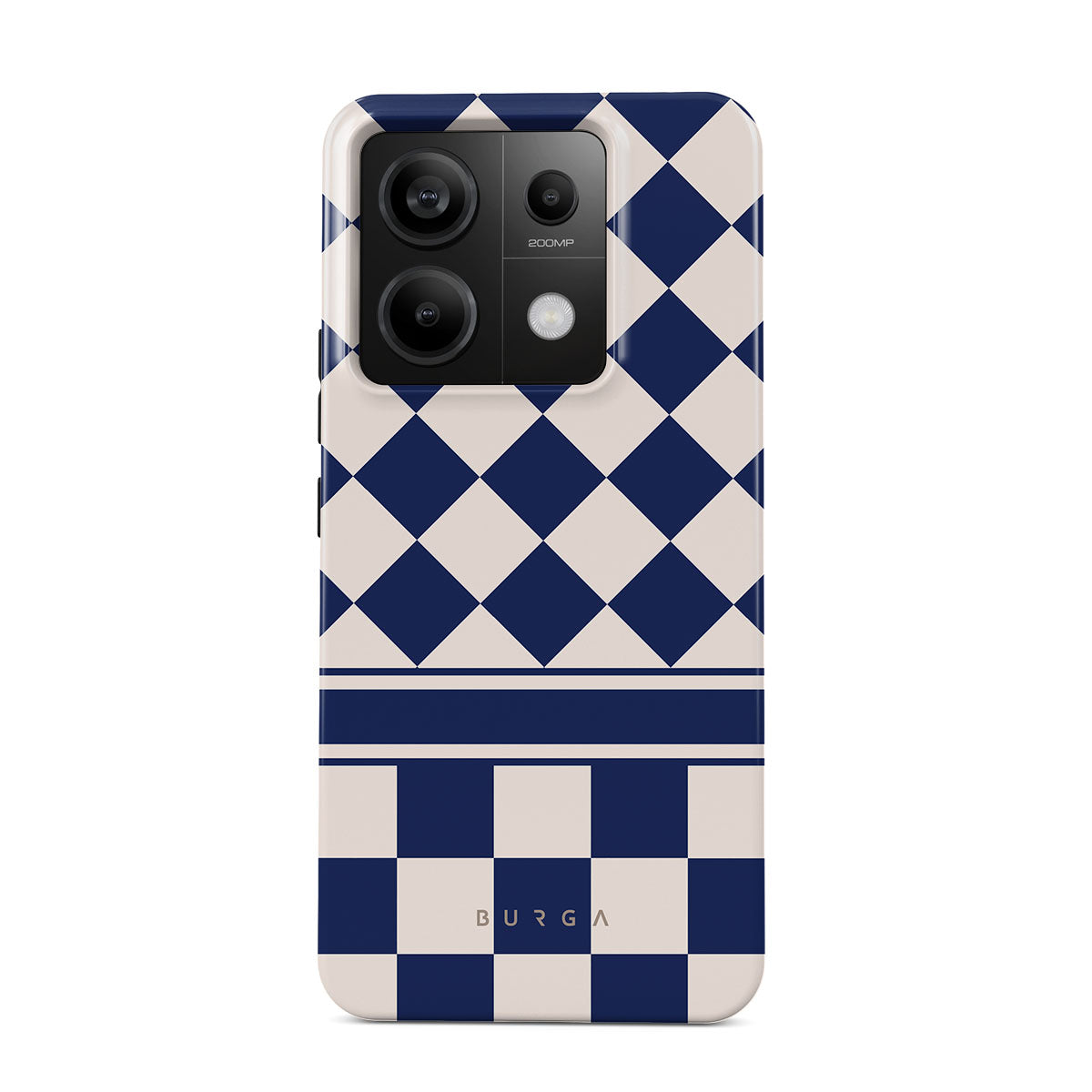 Embrace the essence of subtle luxury with our Check & Mate Xiaomi Redmi Note 13 Pro 5G phone case design. Blending eggshell and deep blue checkers, it evokes whispers of elegance. While diamonds grace the upper half, the lower half features a timeless chessboard pattern.