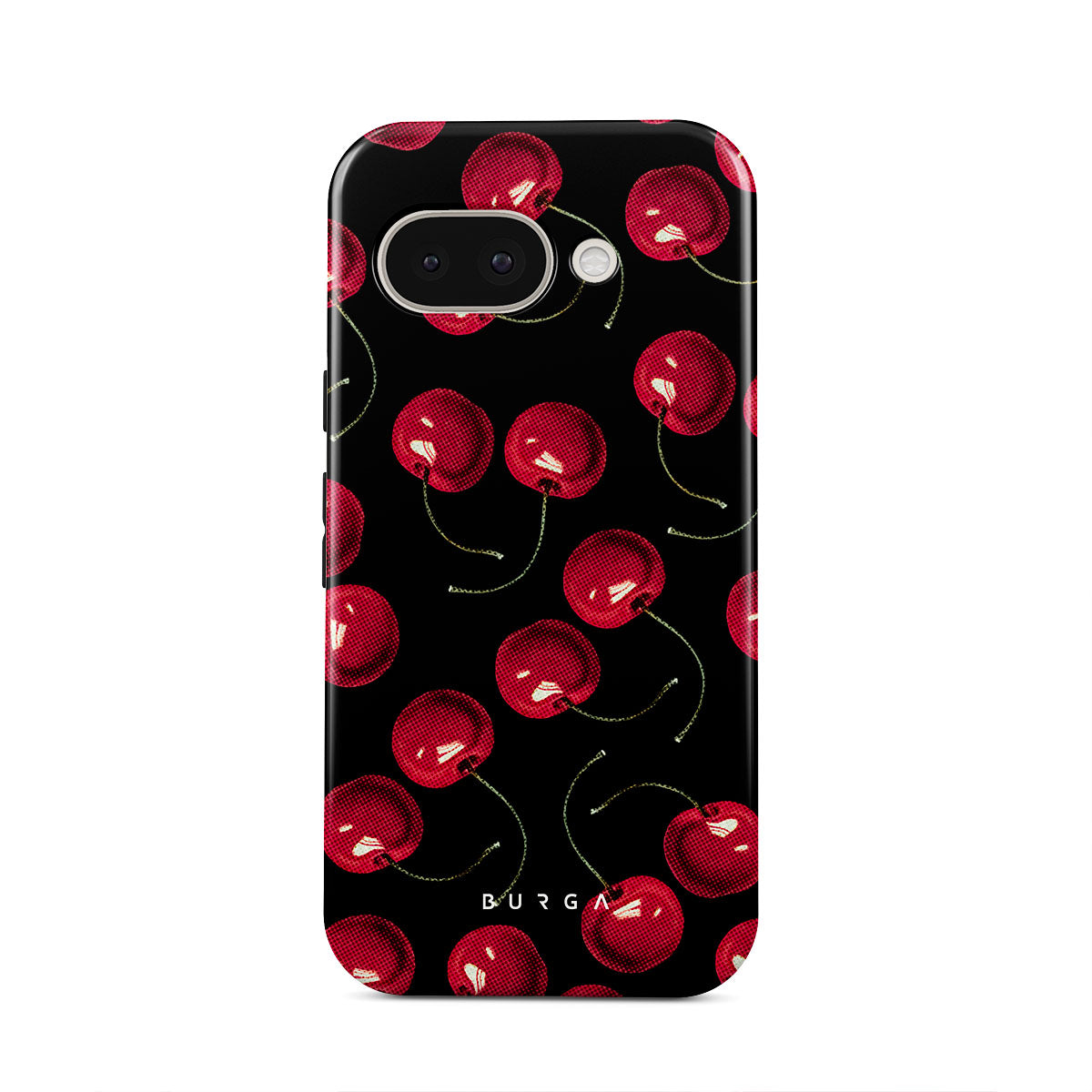 On a deep black background, rich red cherries stand out. Tempting and audacious, our Cherrybomb Google Pixel 9a phone case design is perfect for anyone who likes to keep things simple yet striking.