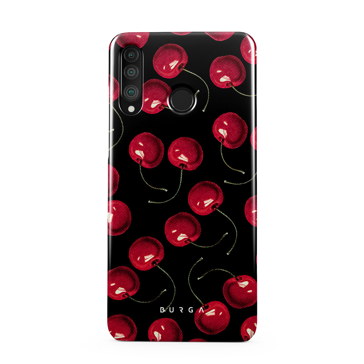 On a deep black background, rich red cherries stand out. Tempting and audacious, our Cherrybomb Huawei P30 Lite phone case design is perfect for anyone who likes to keep things simple yet striking.