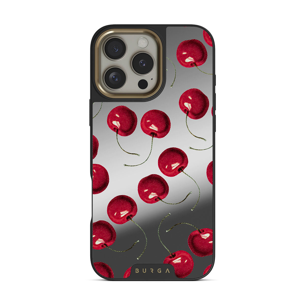On a deep black background, rich red cherries stand out. Tempting and audacious, our Cherrybomb iPhone 16 Pro Max phone case design is perfect for anyone who likes to keep things simple yet striking.
