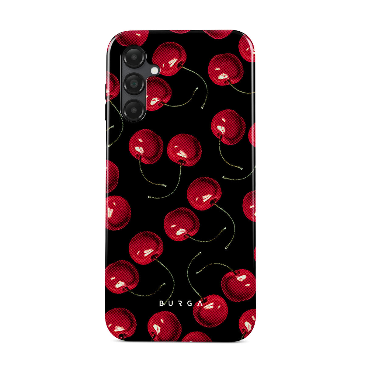 On a deep black background, rich red cherries stand out. Tempting and audacious, our Cherrybomb Samsung Galaxy A25 phone case design is perfect for anyone who likes to keep things simple yet striking.