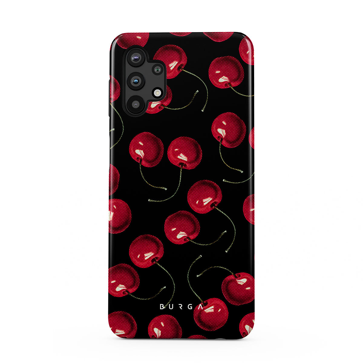 On a deep black background, rich red cherries stand out. Tempting and audacious, our Cherrybomb Samsung Galaxy A32 5G phone case design is perfect for anyone who likes to keep things simple yet striking.