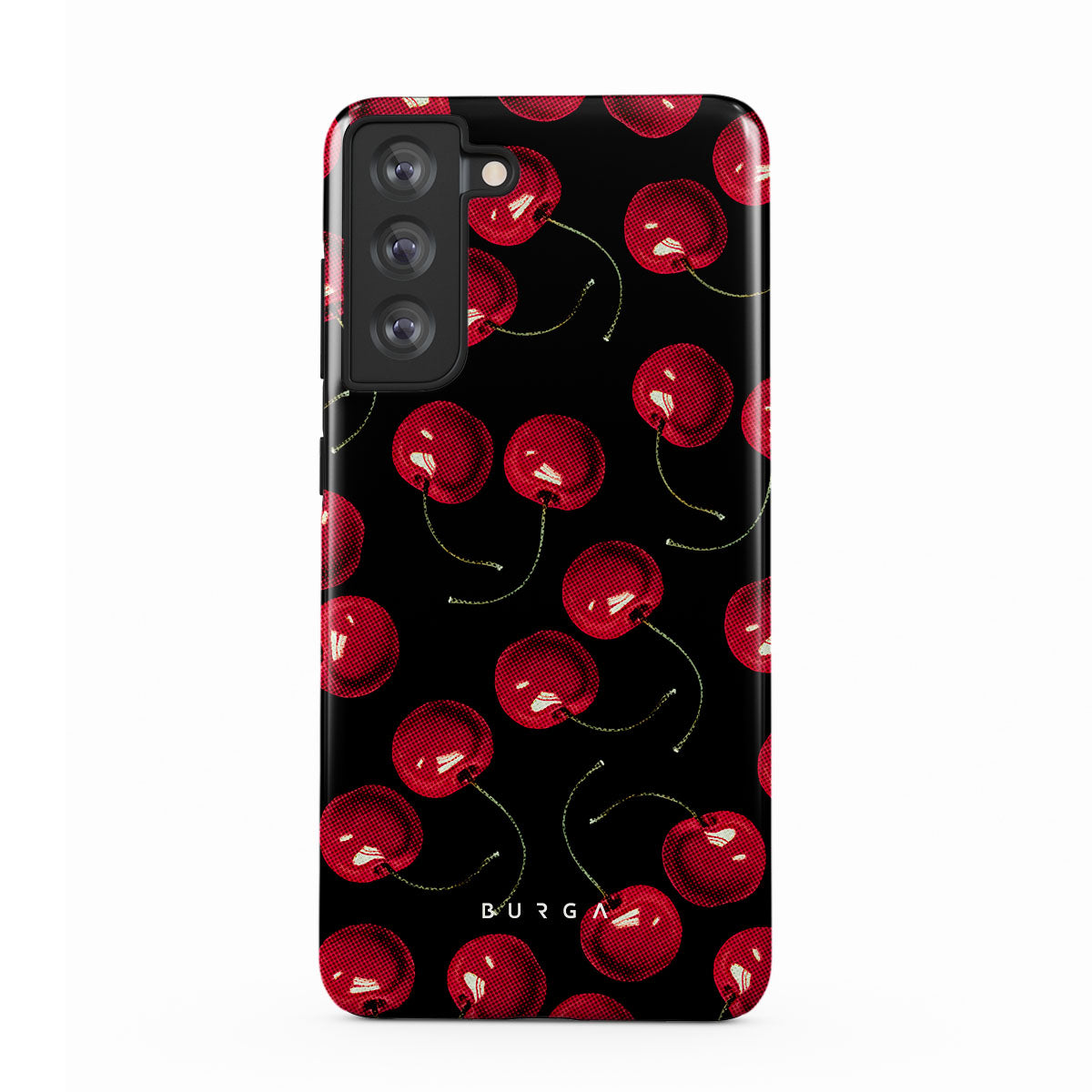 On a deep black background, rich red cherries stand out. Tempting and audacious, our Cherrybomb Samsung Galaxy S21 FE phone case design is perfect for anyone who likes to keep things simple yet striking.