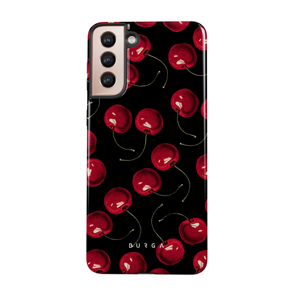 On a deep black background, rich red cherries stand out. Tempting and audacious, our Cherrybomb Samsung Galaxy S21 Plus phone case design is perfect for anyone who likes to keep things simple yet striking.
