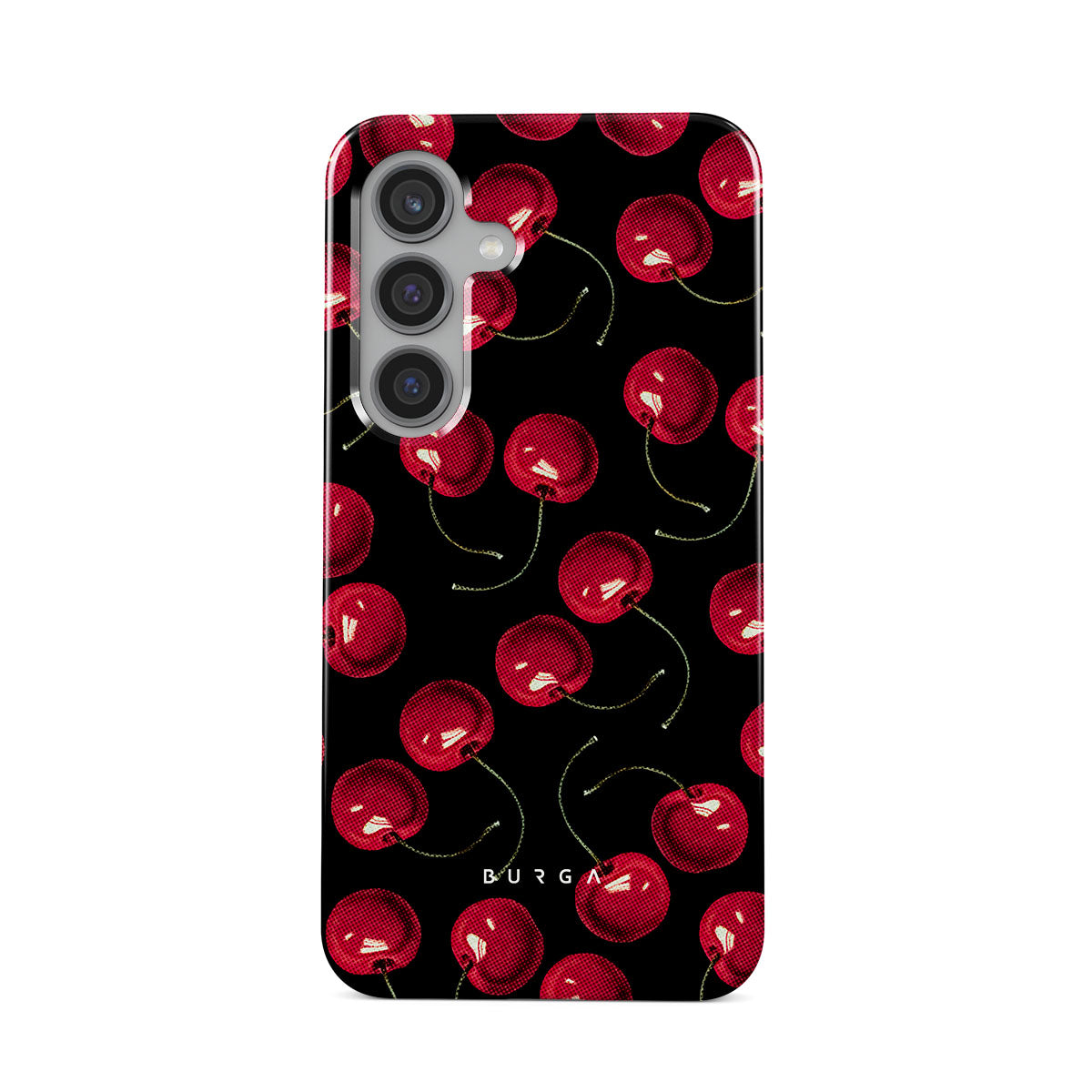 On a deep black background, rich red cherries stand out. Tempting and audacious, our Cherrybomb Samsung Galaxy S24 Plus phone case design is perfect for anyone who likes to keep things simple yet striking.