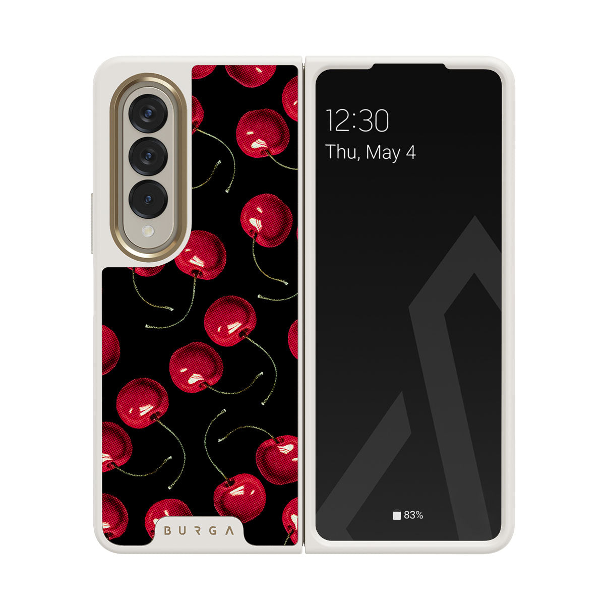 On a deep black background, rich red cherries stand out. Tempting and audacious, our Cherrybomb Samsung Galaxy Z Fold 4 phone case design is perfect for anyone who likes to keep things simple yet striking.