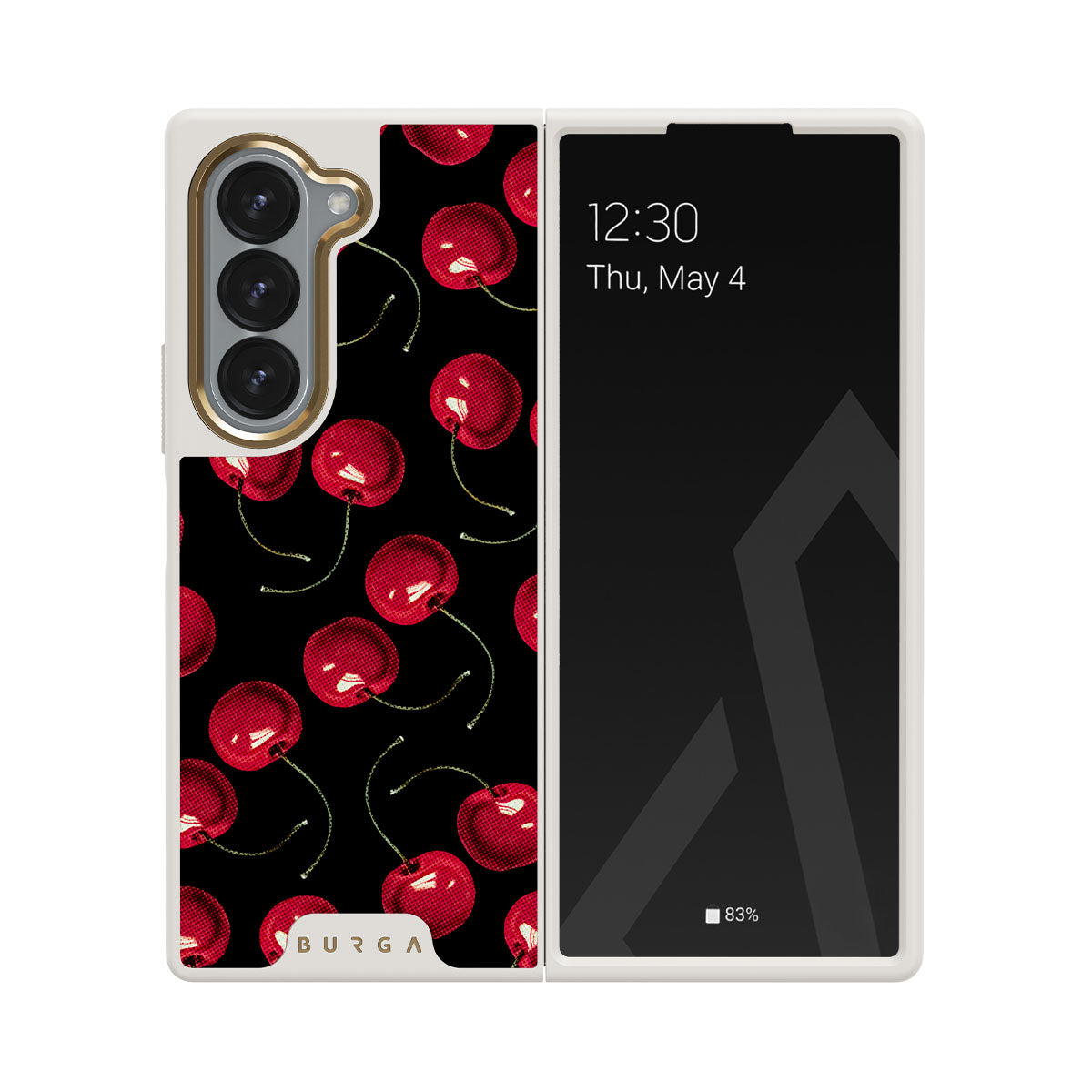 On a deep black background, rich red cherries stand out. Tempting and audacious, our Cherrybomb Samsung Galaxy Z Fold 6 phone case design is perfect for anyone who likes to keep things simple yet striking.