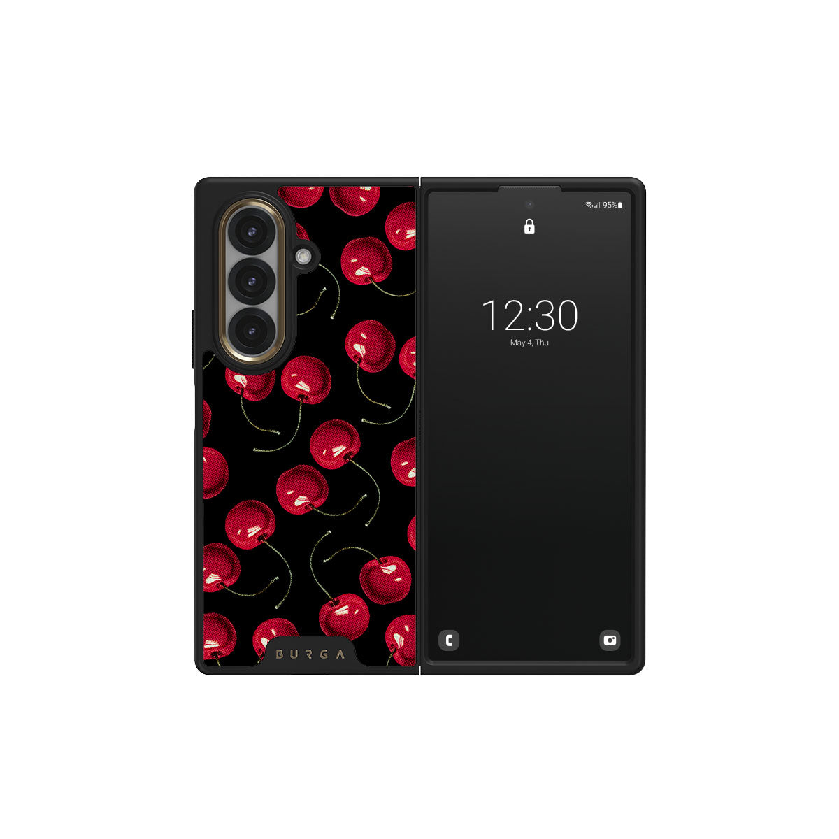 On a deep black background, rich red cherries stand out. Tempting and audacious, our Cherrybomb Samsung Galaxy Z Fold 7 phone case design is perfect for anyone who likes to keep things simple yet striking.