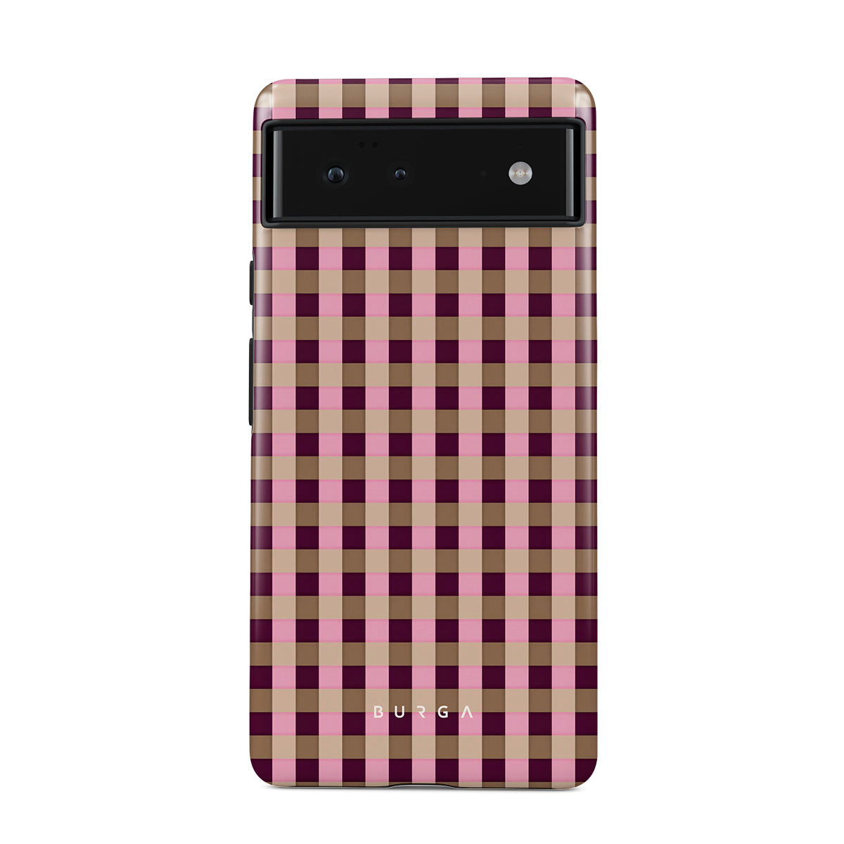 This design features: pink and burgundy plaid pattern, modern checkered style.
