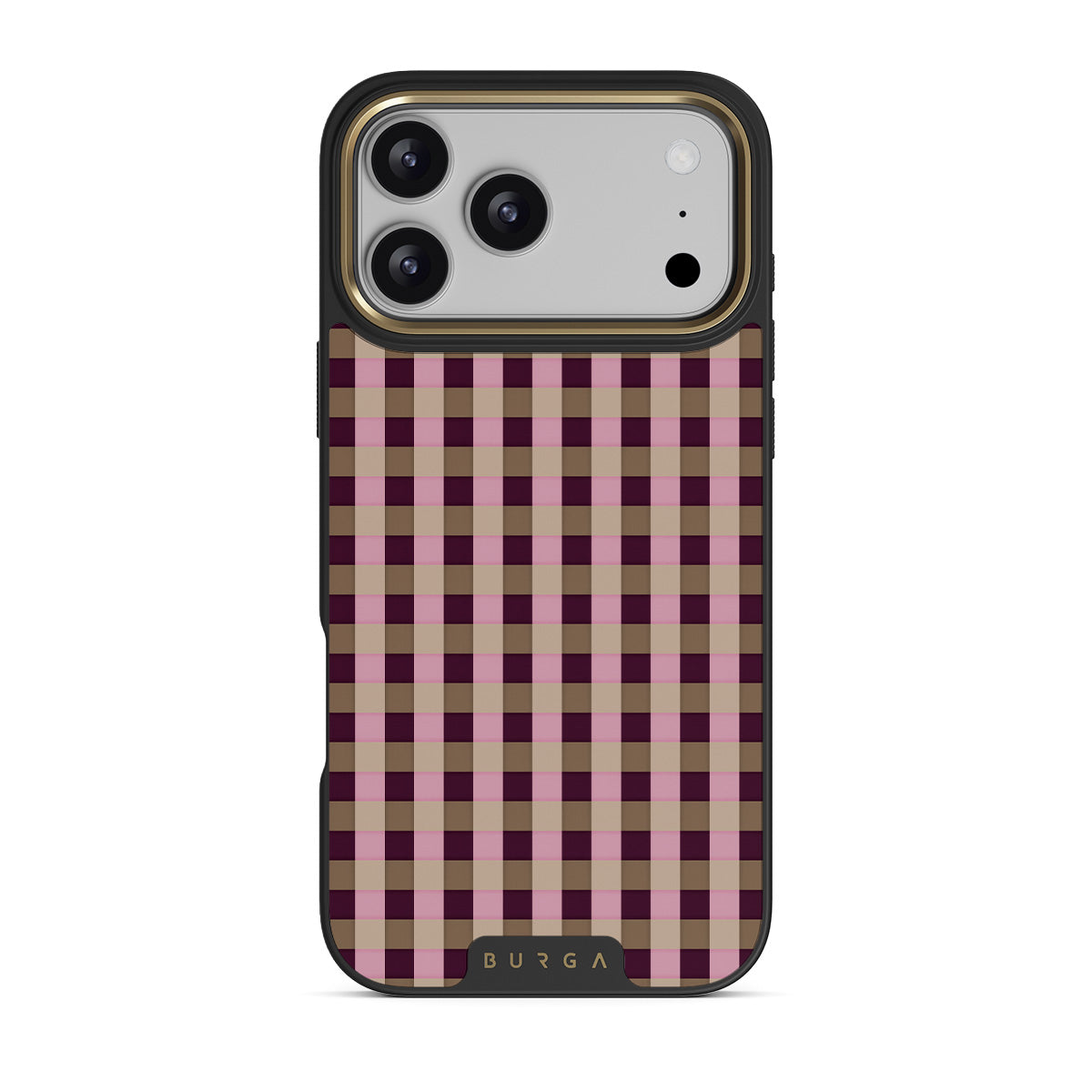 This design features: pink and burgundy plaid pattern, modern checkered style.