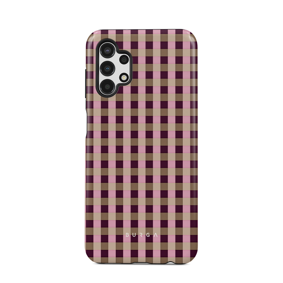 This design features: pink and burgundy plaid pattern, modern checkered style.