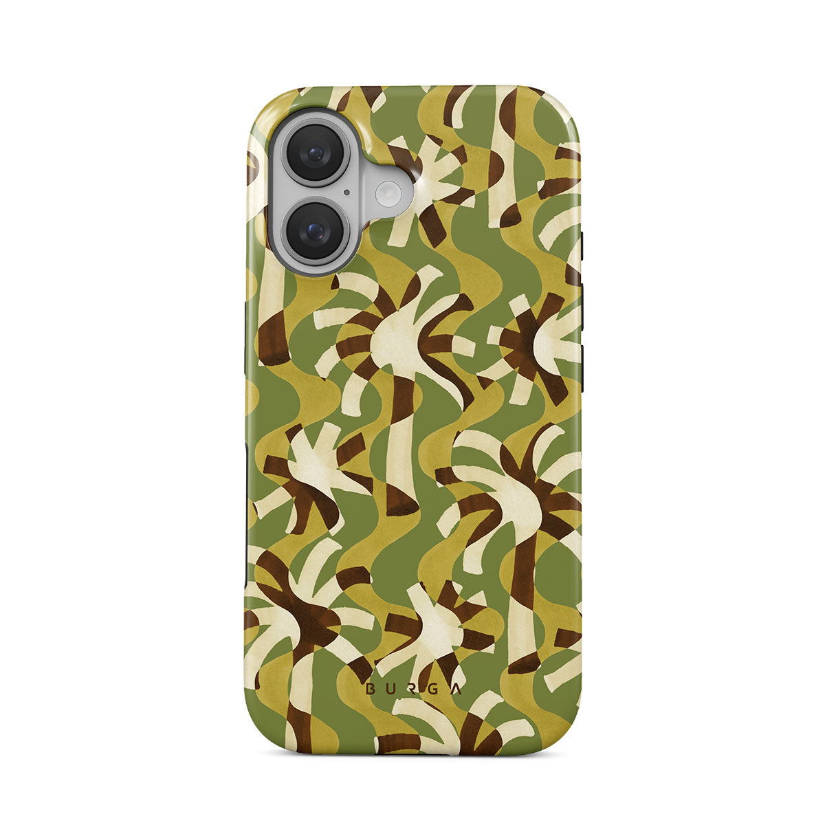 A leafy blur of tropical motion. This iPhone 16 phone case design feels like a memory of a rainforest walk you never took, but wish you had. Hot, hazy, and happily lost.