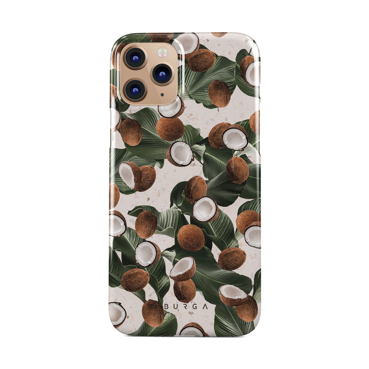 Coconut Crush iPhone 11 Pro phone case showcases a soft creme color design with a playful addition of coconuts on top. The unexpected design duo will add a touch of tropical playfulness to your style while offering heavy-duty protection for your cell phone.