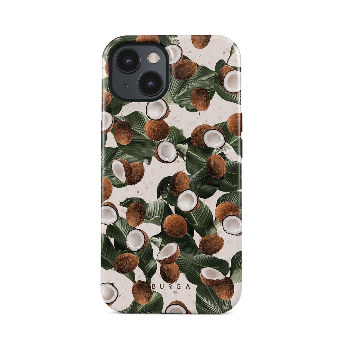 Coconut Crush iPhone 14 phone case showcases a soft creme color design with a playful addition of coconuts on top. The unexpected design duo will add a touch of tropical playfulness to your style while offering heavy-duty protection for your cell phone.