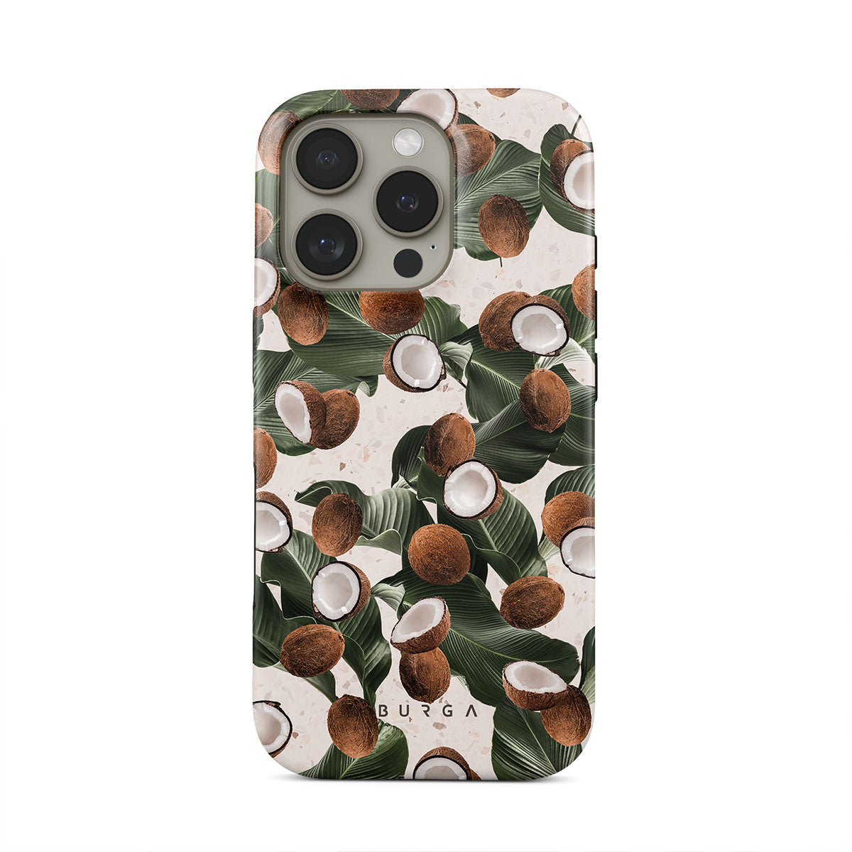 Coconut Crush iPhone 16 Pro phone case showcases a soft creme color design with a playful addition of coconuts on top. The unexpected design duo will add a touch of tropical playfulness to your style while offering heavy-duty protection for your cell phone.
