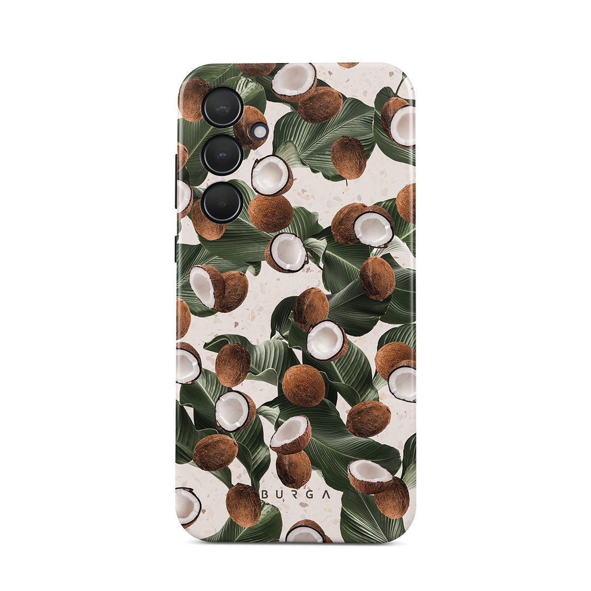 Coconut Crush Samsung Galaxy A51 phone case showcases a soft creme color design with a playful addition of coconuts on top. The unexpected design duo will add a touch of tropical playfulness to your style while offering heavy-duty protection for your cell phone.