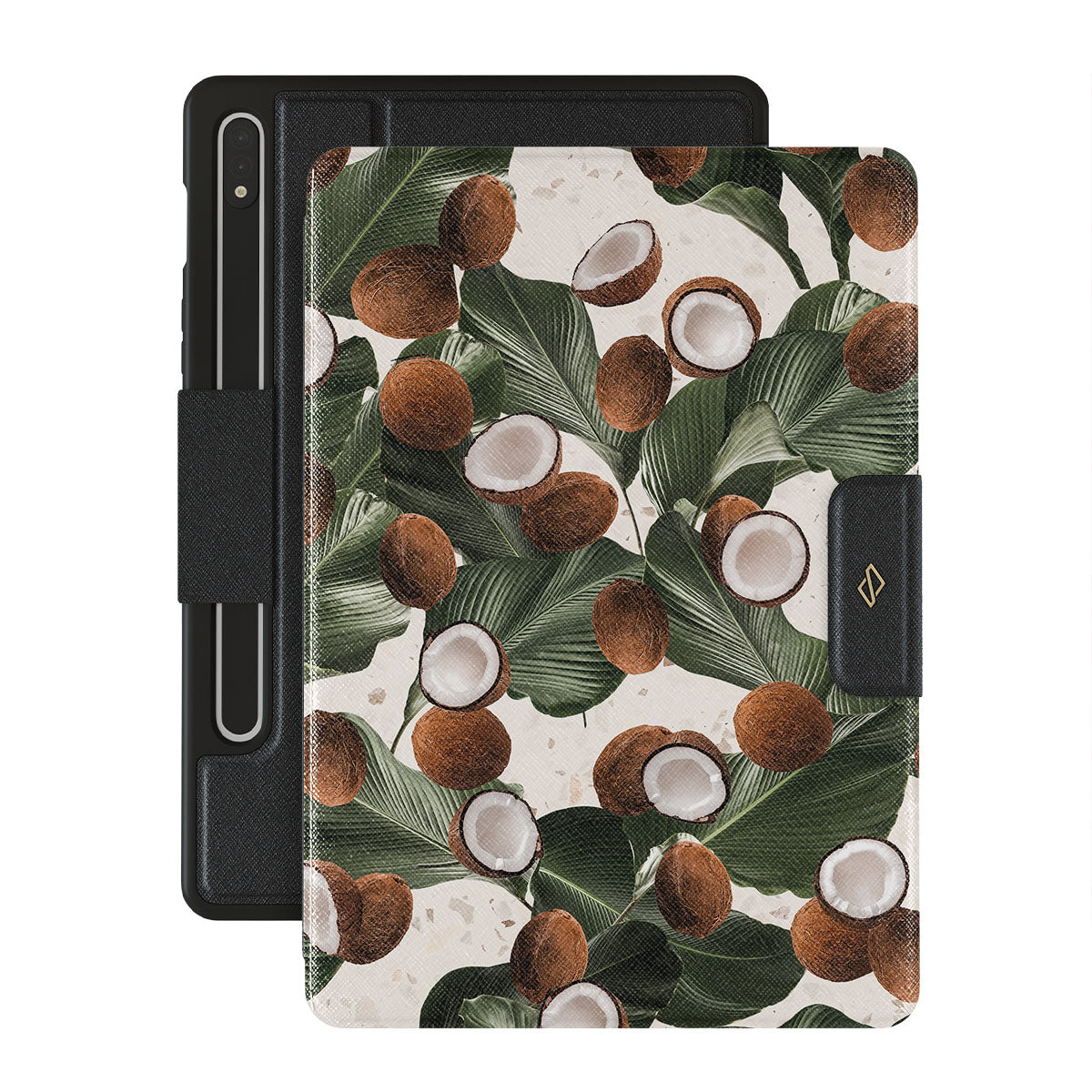 Coconut Crush Samsung Galaxy Tab S9 FE folio case showcases a soft creme color design with a playful addition of coconuts on top. The unexpected design duo will add a touch of tropical playfulness to your style while offering heavy-duty protection for your cell Galaxy Tab.