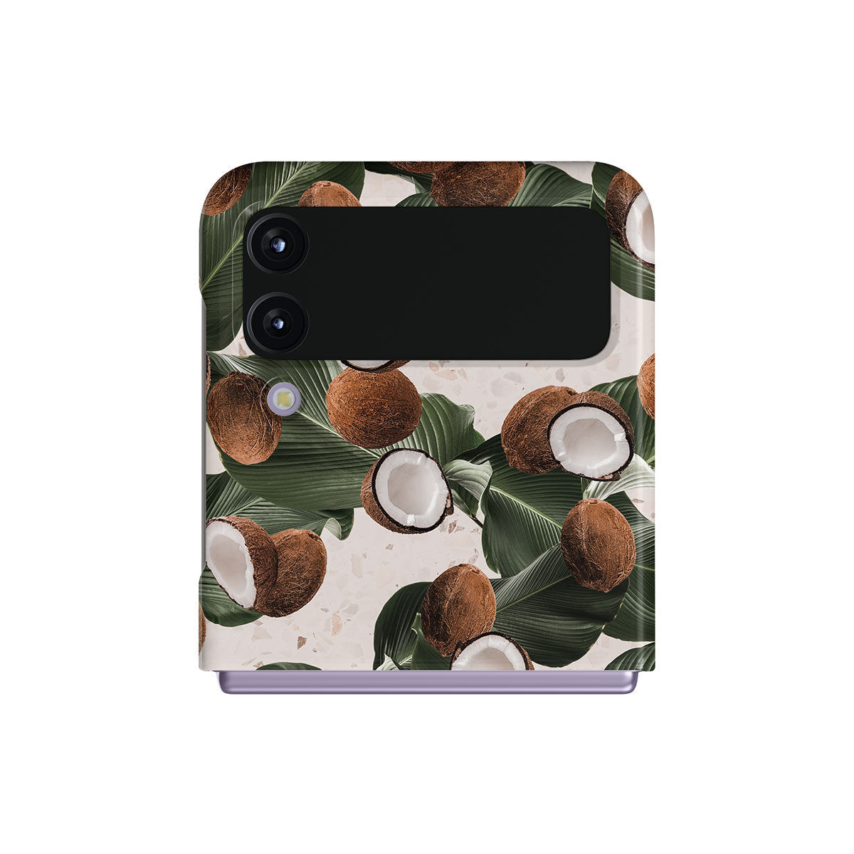 Coconut Crush Samsung Galaxy Z Flip 4 phone case showcases a soft creme color design with a playful addition of coconuts on top. The unexpected design duo will add a touch of tropical playfulness to your style while offering heavy-duty protection for your cell phone.