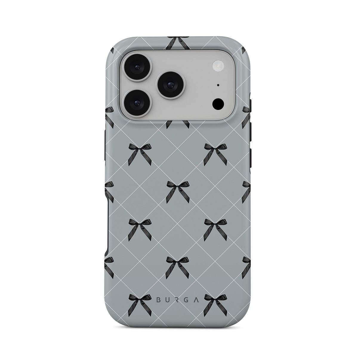 A subtle hint to a world of dance and soft melodies. Crisscrossing bows over a muted gray tone capture the flirtatious essence of the coquette-core aesthetic. Playful and sweet, our Coquette iPhone 17 Pro phone case design is perfect for those who find beauty in the details.