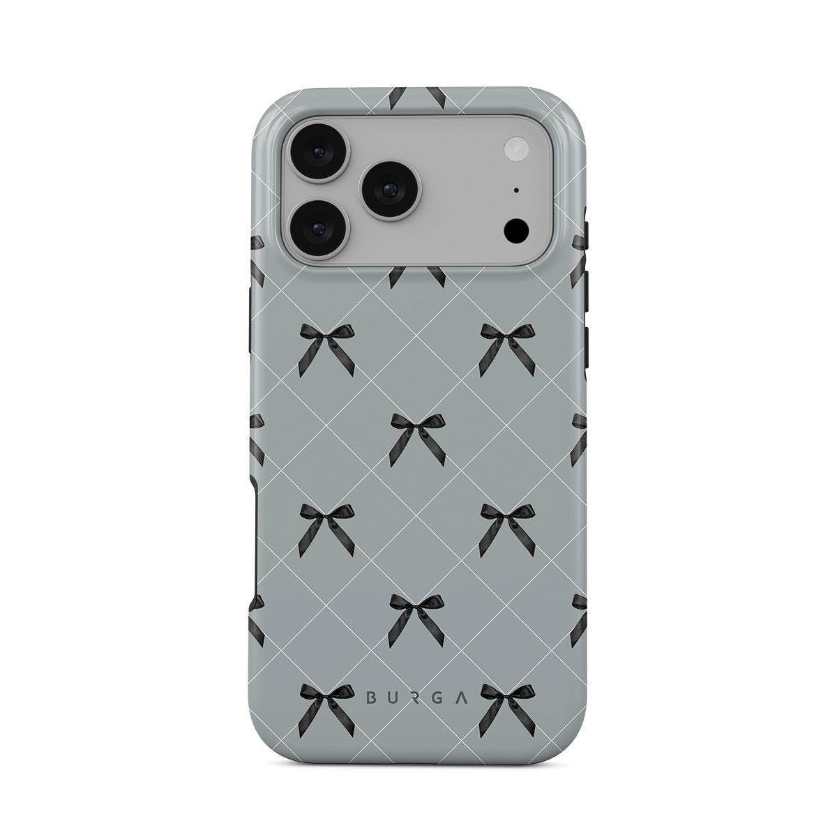 A subtle hint to a world of dance and soft melodies. Crisscrossing bows over a muted gray tone capture the flirtatious essence of the coquette-core aesthetic. Playful and sweet, our Coquette iPhone 17 Pro Max phone case design is perfect for those who find beauty in the details.