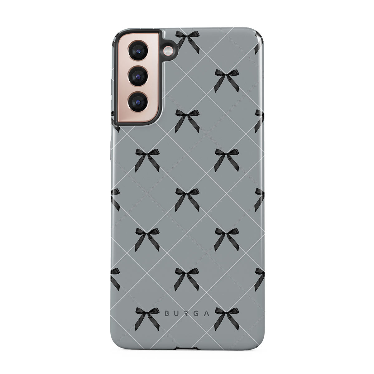 A subtle hint to a world of dance and soft melodies. Crisscrossing bows over a muted gray tone capture the flirtatious essence of the coquette-core aesthetic. Playful and sweet, our Coquette Samsung Galaxy S21 Plus phone case design is perfect for those who find beauty in the details.