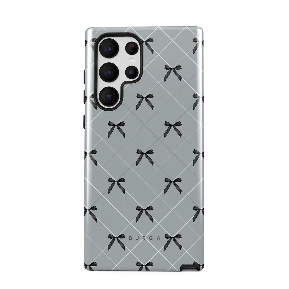 A subtle hint to a world of dance and soft melodies. Crisscrossing bows over a muted gray tone capture the flirtatious essence of the coquette-core aesthetic. Playful and sweet, our Coquette Samsung Galaxy S22 Ultra phone case design is perfect for those who find beauty in the details.