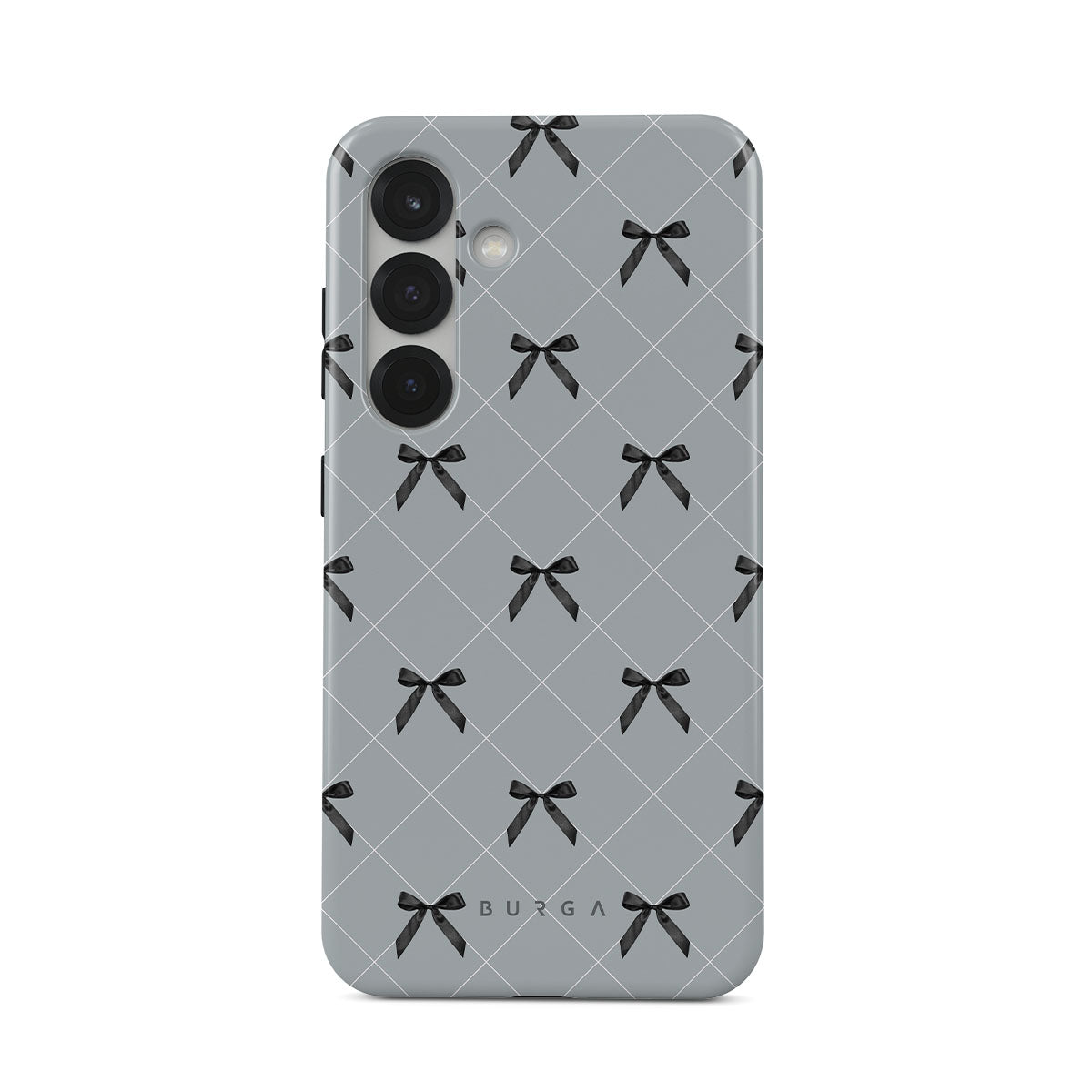 A subtle hint to a world of dance and soft melodies. Crisscrossing bows over a muted gray tone capture the flirtatious essence of the coquette-core aesthetic. Playful and sweet, our Coquette Samsung Galaxy S25 phone case design is perfect for those who find beauty in the details.