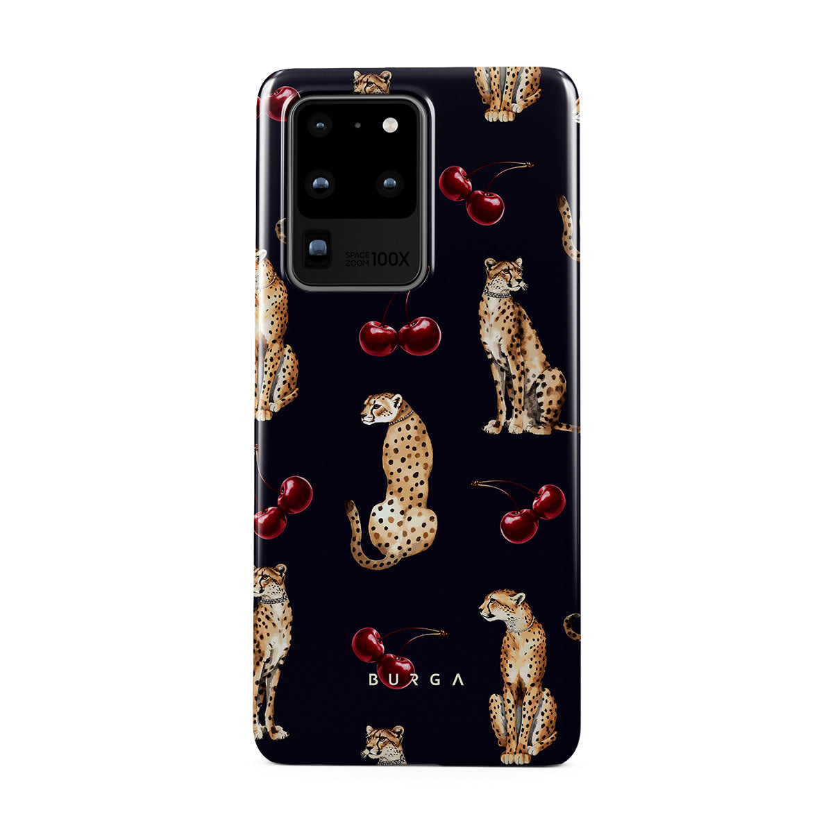 This design features: cheetah patterns, cheetahs, cherries