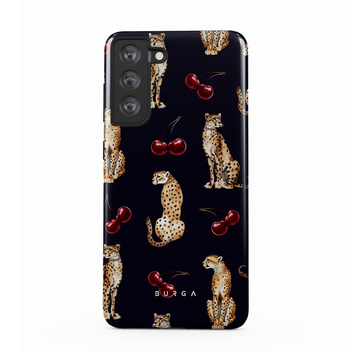 This design features: cheetah patterns, cheetahs, cherries