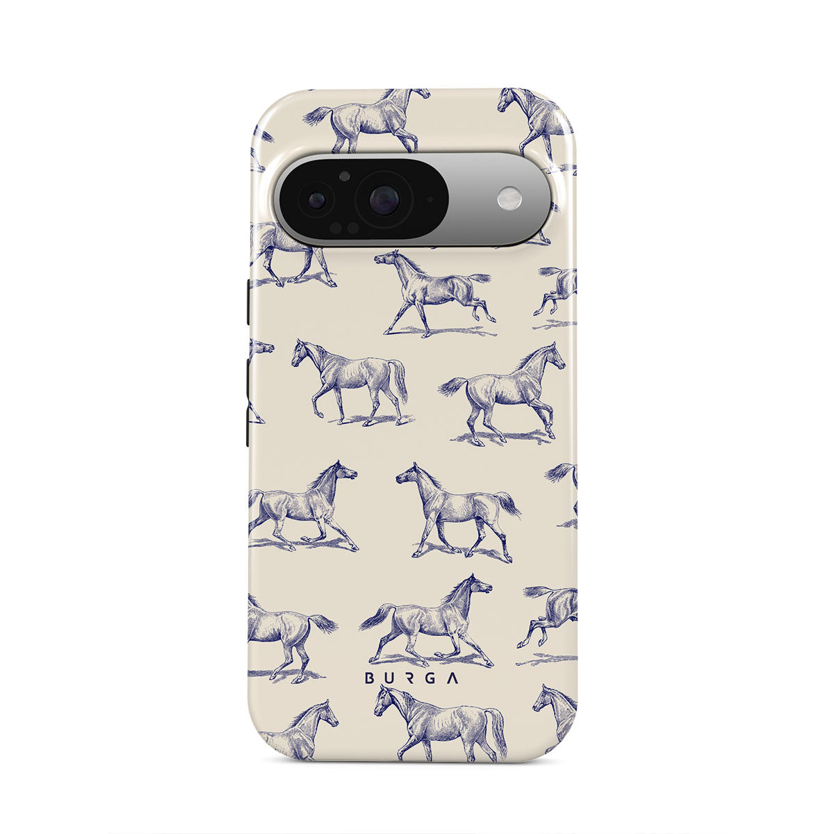 Introducing our Derby Race Google Pixel 9 phone case design—a portrait of elegance in motion on a soft nude canvas. Engraved in delicate blue contours, galloping horses dance upon the wind, frozen in an exquisite moment of grace.