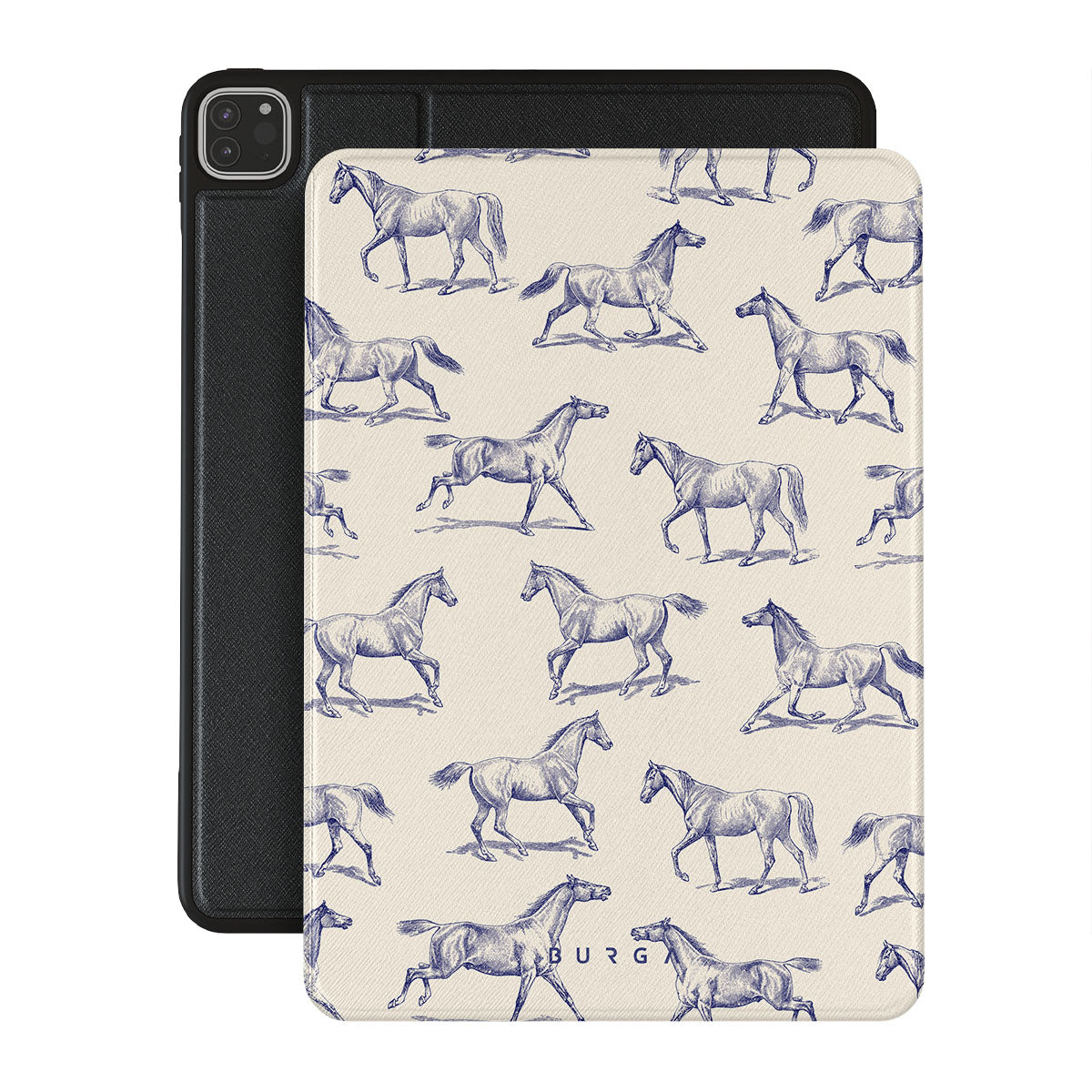 Introducing our Derby Race iPad Pro 11 (4th/3rd Gen) folio case designa portrait of elegance in motion on a soft nude canvas. Engraved in delicate blue contours, galloping horses dance upon the wind, frozen in an exquisite moment of grace.