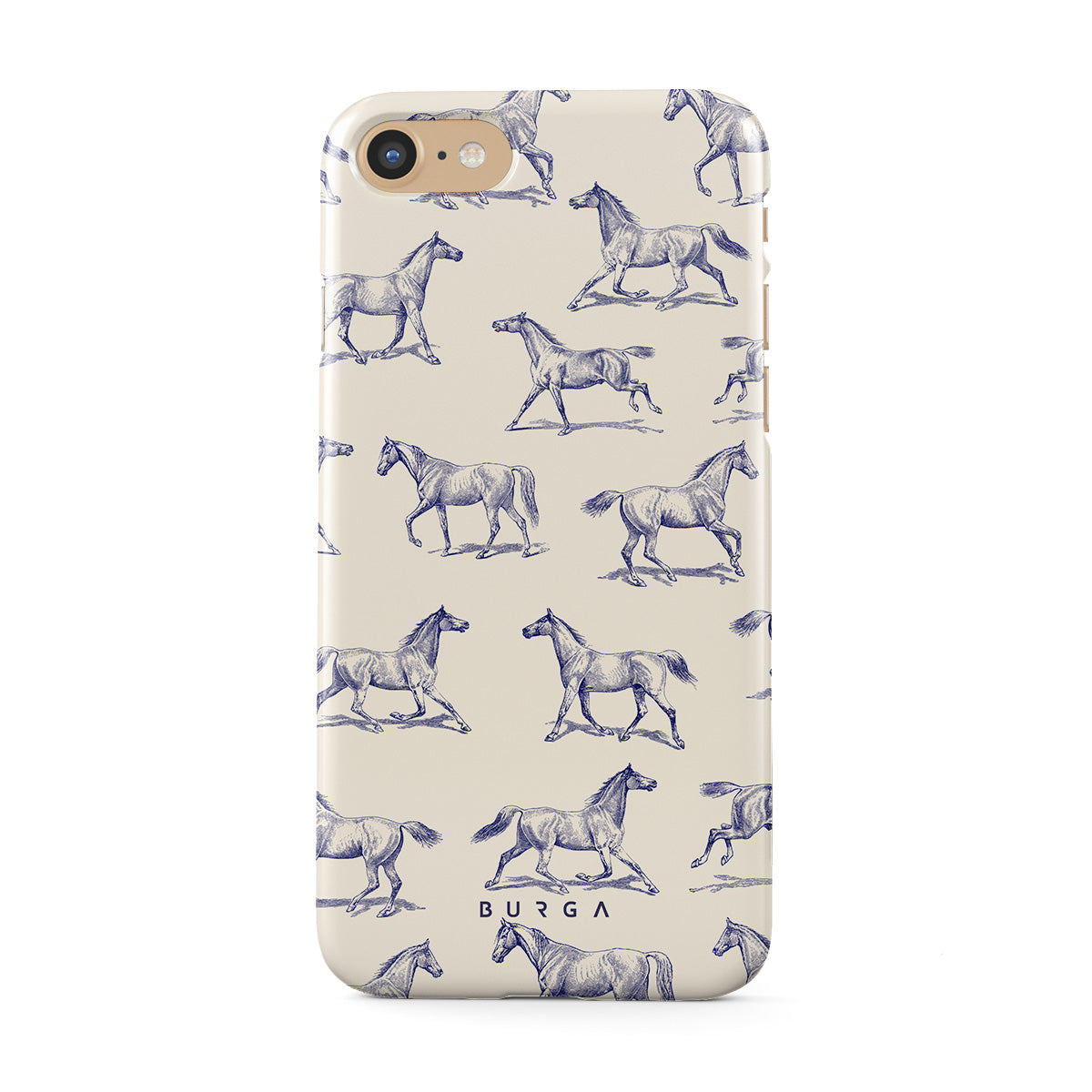 Introducing our Derby Race iPhone SE (2022) phone case designa portrait of elegance in motion on a soft nude canvas. Engraved in delicate blue contours, galloping horses dance upon the wind, frozen in an exquisite moment of grace.