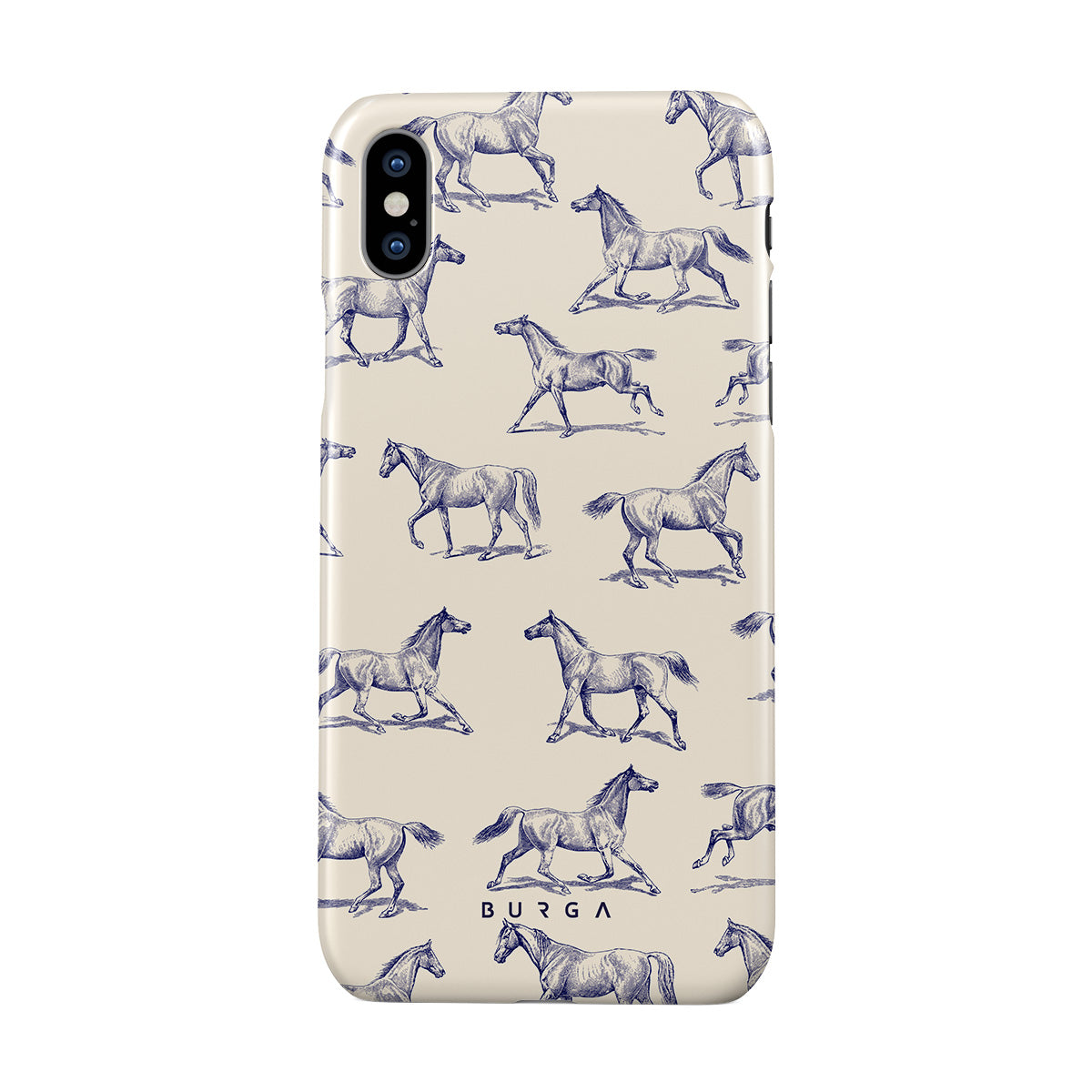 Introducing our Derby Race iPhone X / XS phone case designa portrait of elegance in motion on a soft nude canvas. Engraved in delicate blue contours, galloping horses dance upon the wind, frozen in an exquisite moment of grace.