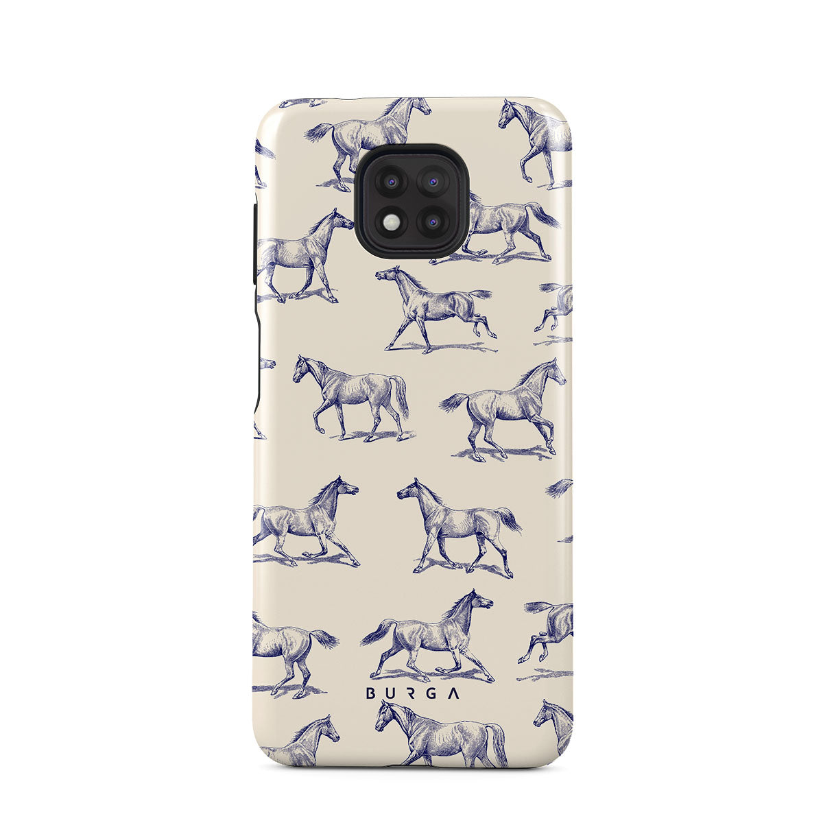 Introducing our Derby Race Motorola Moto G Power 2021 phone case designa portrait of elegance in motion on a soft nude canvas. Engraved in delicate blue contours, galloping horses dance upon the wind, frozen in an exquisite moment of grace.