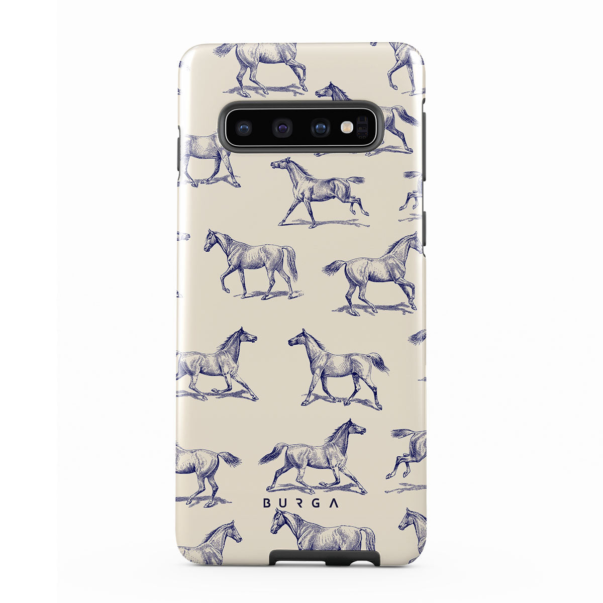 Introducing our Derby Race Samsung Galaxy S10 4G phone case designa portrait of elegance in motion on a soft nude canvas. Engraved in delicate blue contours, galloping horses dance upon the wind, frozen in an exquisite moment of grace.