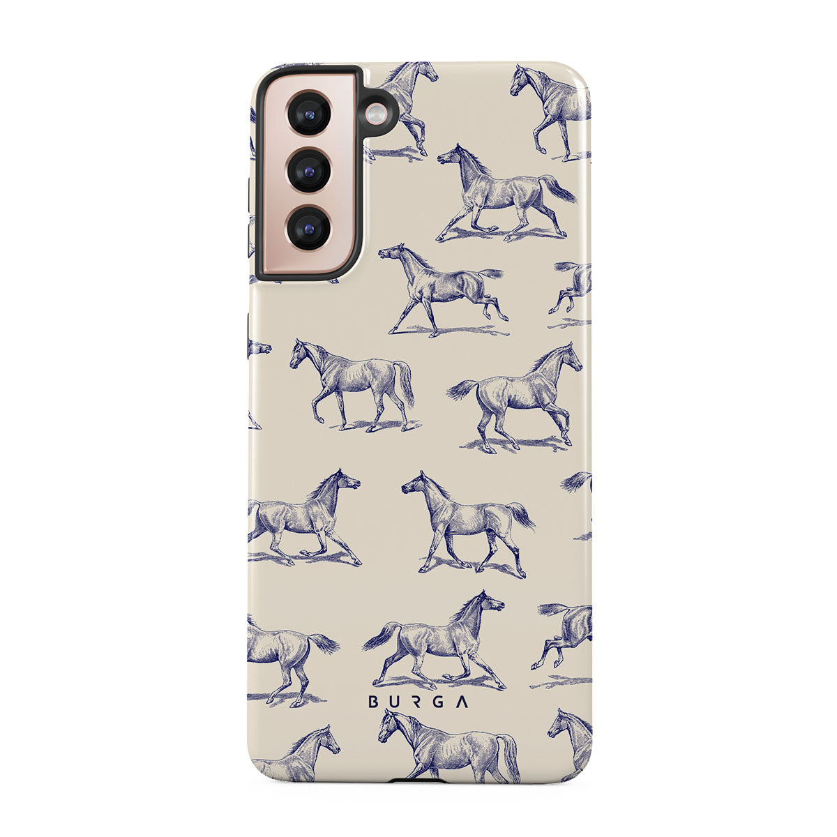 Introducing our Derby Race Samsung Galaxy S21 Plus phone case designa portrait of elegance in motion on a soft nude canvas. Engraved in delicate blue contours, galloping horses dance upon the wind, frozen in an exquisite moment of grace.