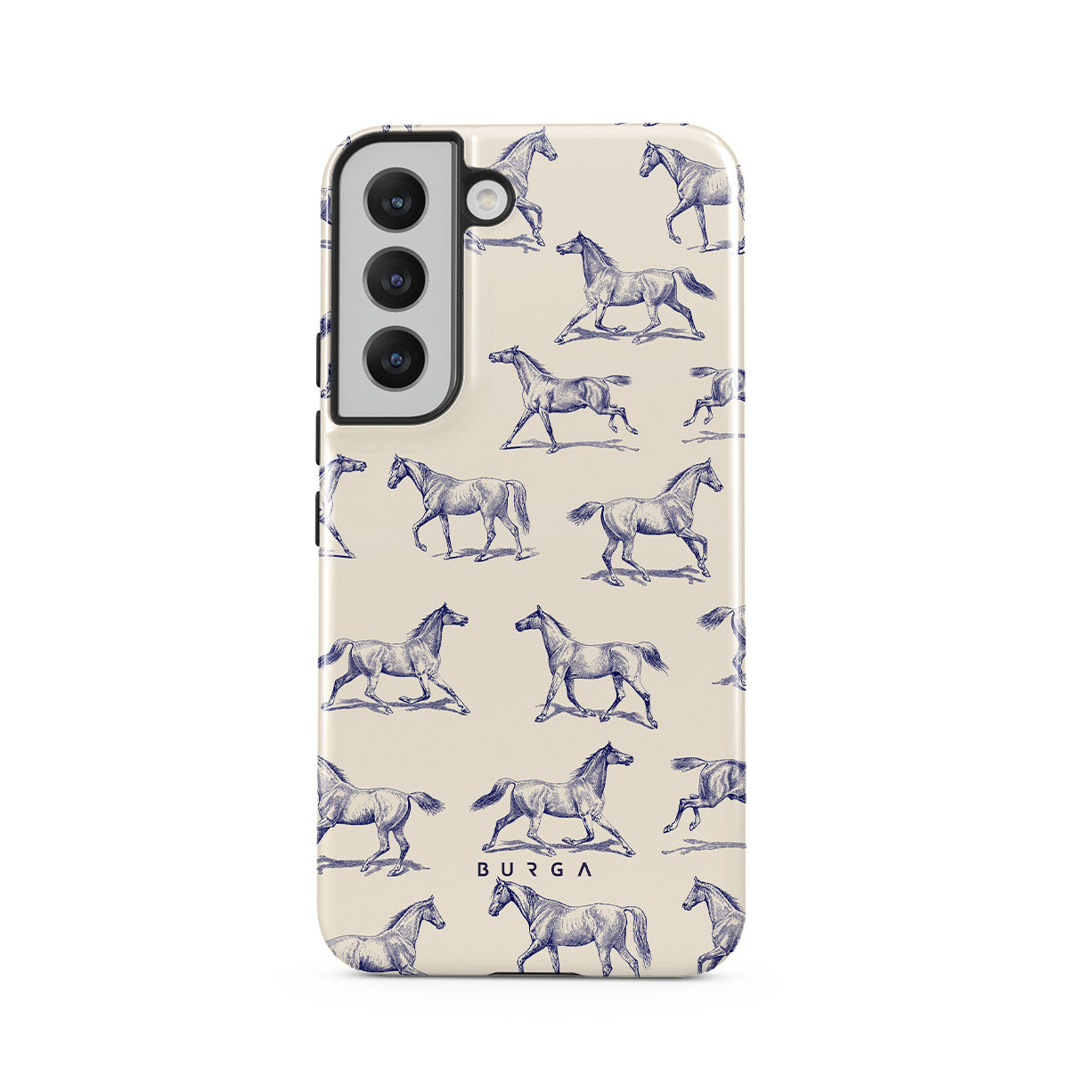 Introducing our Derby Race Samsung Galaxy S22 phone case design—a portrait of elegance in motion on a soft nude canvas. Engraved in delicate blue contours, galloping horses dance upon the wind, frozen in an exquisite moment of grace.