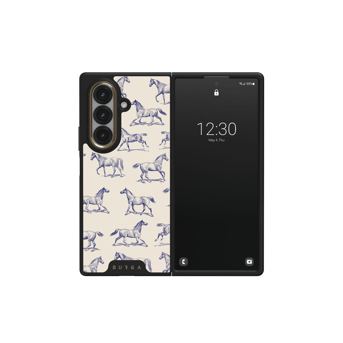 Introducing our Derby Race Samsung Galaxy Z Fold 7 phone case design—a portrait of elegance in motion on a soft nude canvas. Engraved in delicate blue contours, galloping horses dance upon the wind, frozen in an exquisite moment of grace.