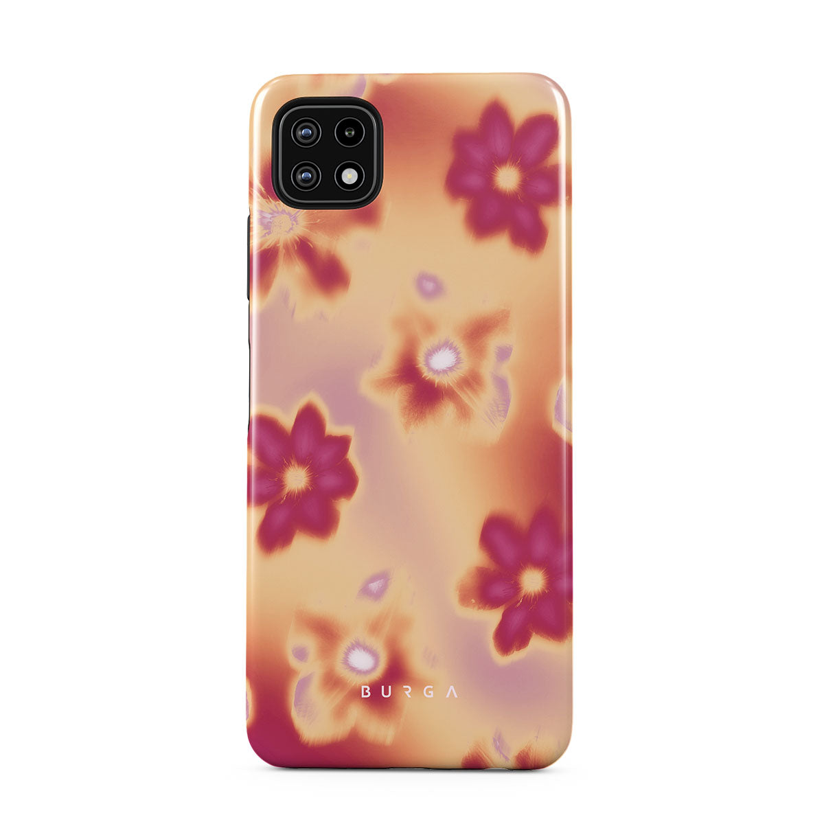Get lost in the allure of our Divine Samsung Galaxy A22 5G phone case design. Picture blossoms bathed in fiery hues of pink and orange, each seemingly charged with life's raw energy. Set against a canvas that radiates power and warmth, these flowers offer more than just beauty; they resonate with the essence that binds us all.
