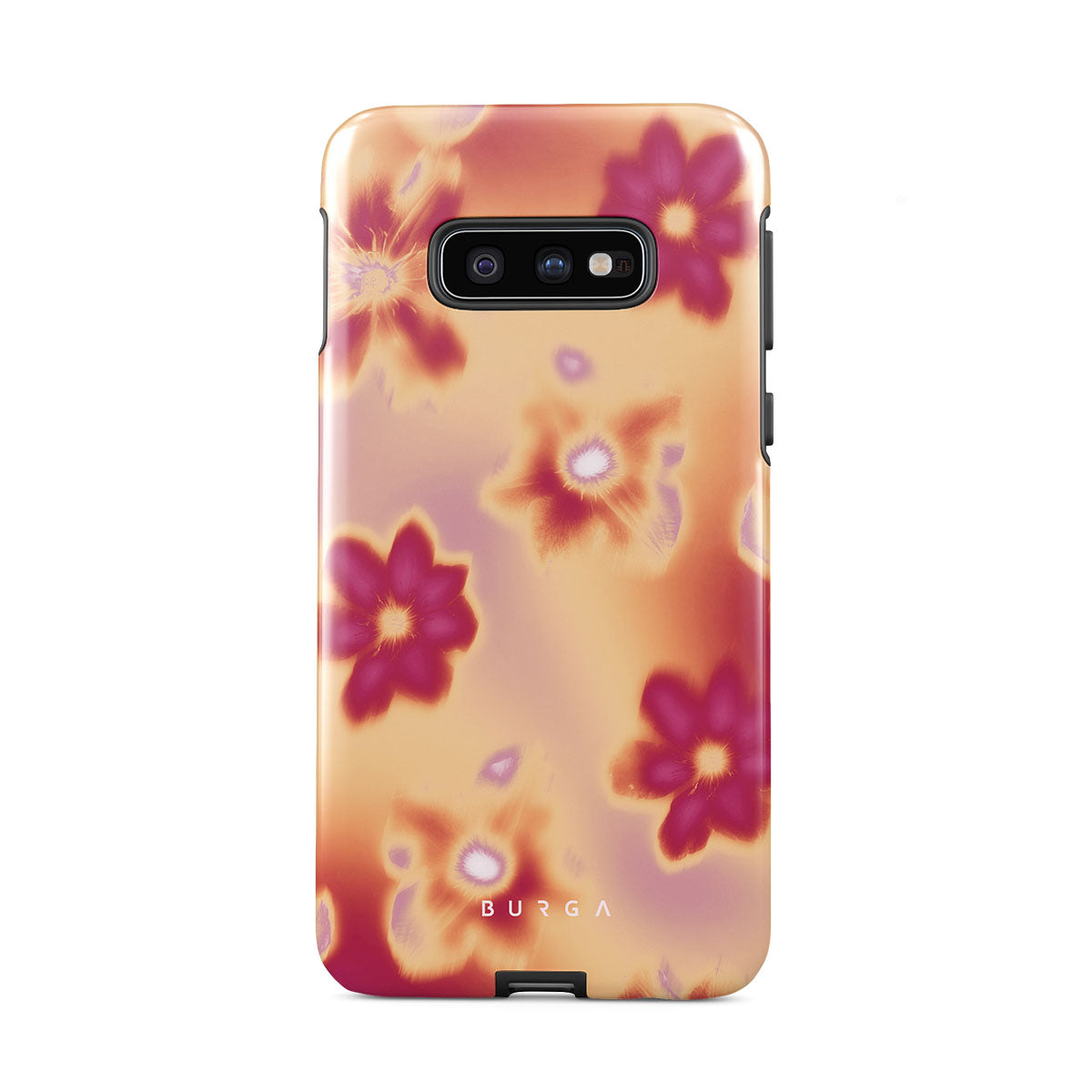 Get lost in the allure of our Divine Samsung Galaxy S10E phone case design. Picture blossoms bathed in fiery hues of pink and orange, each seemingly charged with life's raw energy. Set against a canvas that radiates power and warmth, these flowers offer more than just beauty; they resonate with the essence that binds us all.