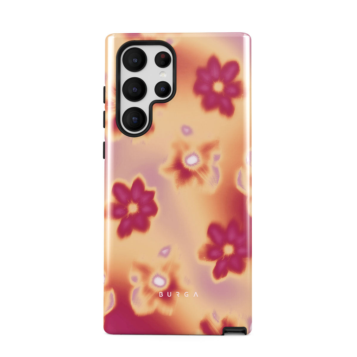 Get lost in the allure of our Divine Samsung Galaxy S22 Ultra phone case design. Picture blossoms bathed in fiery hues of pink and orange, each seemingly charged with life's raw energy. Set against a canvas that radiates power and warmth, these flowers offer more than just beauty; they resonate with the essence that binds us all.
