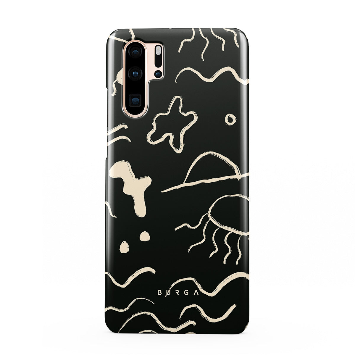 Our Eclipse Huawei P30 Pro design reflects the enigmatic beauty of the ocean during a solar eclipse. The dark hues and bright accents represent how the light dances on the water, while the waves and jellyfish capture the serene yet dynamic nature of the ocean.