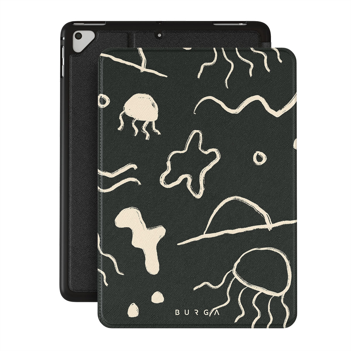 Our Eclipse iPad 9.7 (6th/5th Gen) folio case reflects the enigmatic beauty of the ocean during a solar eclipse. The dark hues and bright accents represent how the light dances on the water, while the waves and jellyfish capture the serene yet dynamic nature of the ocean.